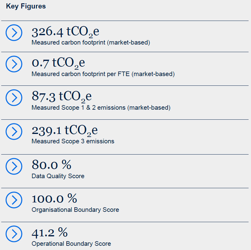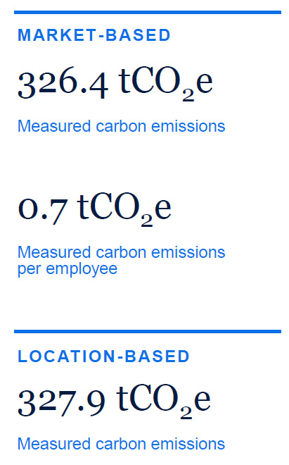 - Scope 3: ~299.04 tCO₂e (supply chain, commuting, waste).